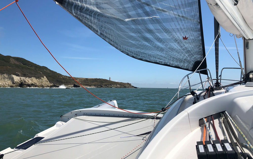 As expected, the larger multihulls powered away through the chop, led by the MOD70 PowerPlay, and we rounded the iconic Needles with many larger racing yachts still in front. The sky cleared and we flew the Code 0 towards St Catherines, making steady progress towards the front of the monohull fleet, before switching to the gennaker for the run to Bembridge Ledge buoy. As the breeze built to F5-6, we gybed repeatedly to stay inshore to minimise the foul tide and hold off the monohull pack behind.